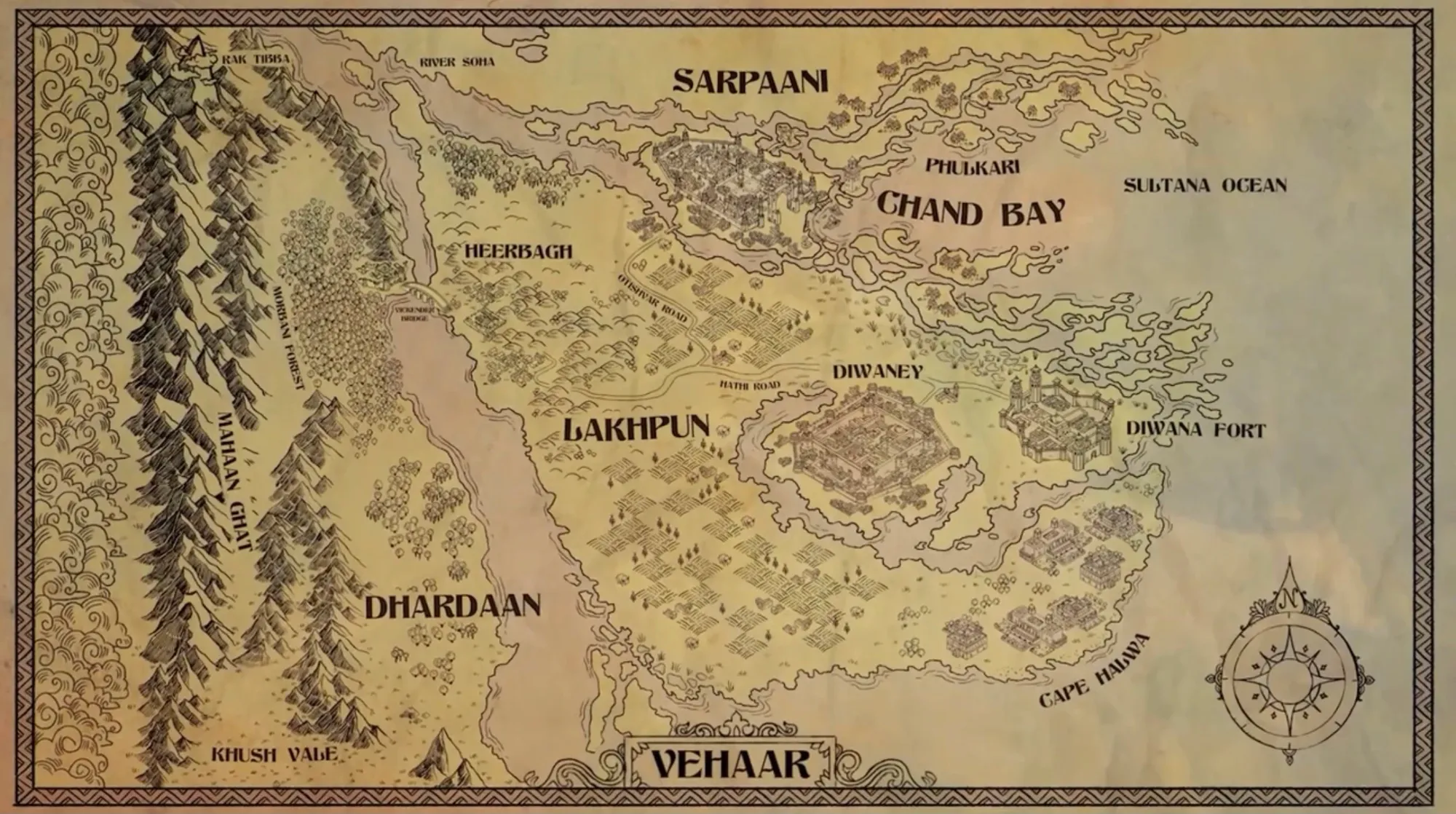 The image above is the map for Vehaar, Jasmine's original setting for this campaign. What I love about this map is that it has so much more potential. The first season only touches on one city and the Rak Tibba mountain in the top left.